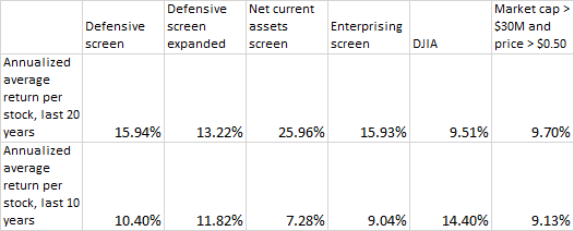 Now Graham himself may not have stuck with this screen. He devotes considerable space in The Intelligent Investor to showing how the screen would narrow the number of stocks in the Dow Jones Industrials down to the really choice ones. This screen, however, would exclude all stocks in the DJI nowadays. Over the last twenty years, screening every week, not a single stock in the DJI would have passed.