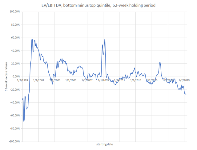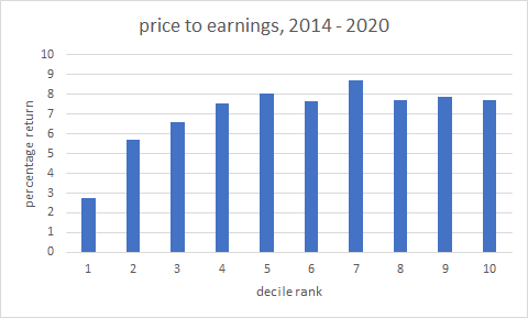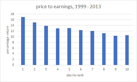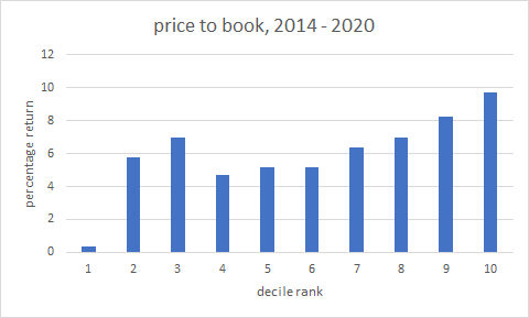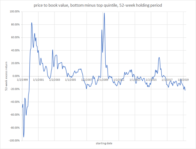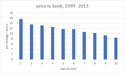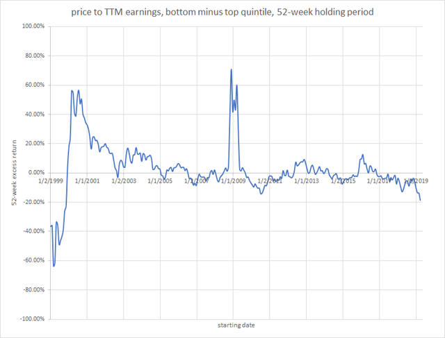 With these metrics (the first two are quite commonly used, the third has been largely forgotten), there has clearly been a recent diminution in the degree to which the top quintile exceeds the bottom quintile. But, significantly, there has been no real value inversion. The ratios may be less effective now, but they still work.