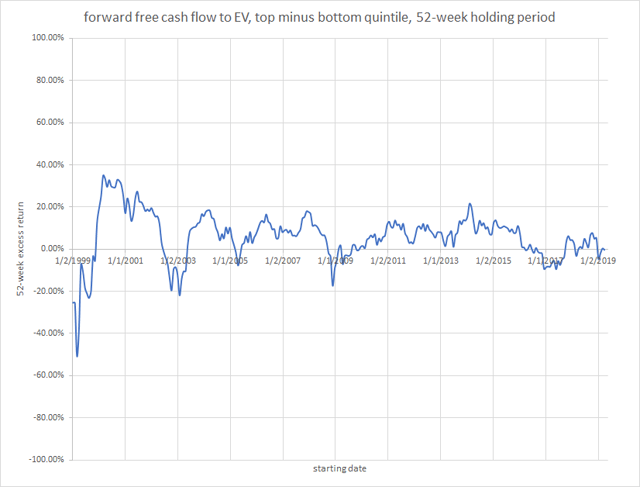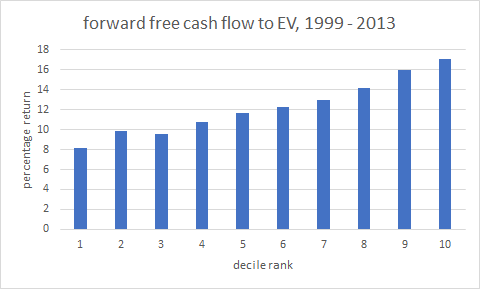 The reason that forward free cash flow to EV works better than free cash flow to price is fourfold. First, companies with negative free cash flow were excluded in the first measure and included in the second. Second, free cash flow to price has, arguably, been subject to more arbitrage. Third, the measure I’m using compares companies in the same sector rather than the entire universe. I do this so that sectors with typically low free cash flow, such as utilities, don’t get punished. And fourth, enterprise value allows one to consider the entirety of a company’s value rather than only the value of its equity, and free cash flow is generated by the entirety of a company’s capital, not only its equity.