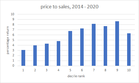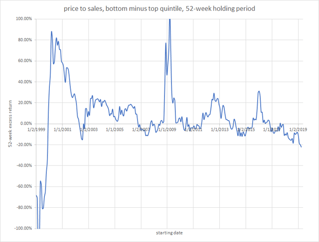 But things began to change in 2014. Between January 1, 2014 and today, if you had invested in the lowest quintile of price-to-sales stocks, with monthly rebalancing and ignoring transaction costs, you would have lost 24.08% of your money; if you had invested in stocks with the highest price-to-sales ratio during that period, you would have made a profit of 40.23%. That’s an astonishing 64-point difference. There have been periods of value inversion before, but I don’t think there’s ever been one this long and this severe.