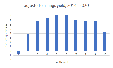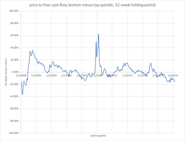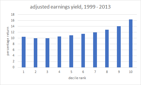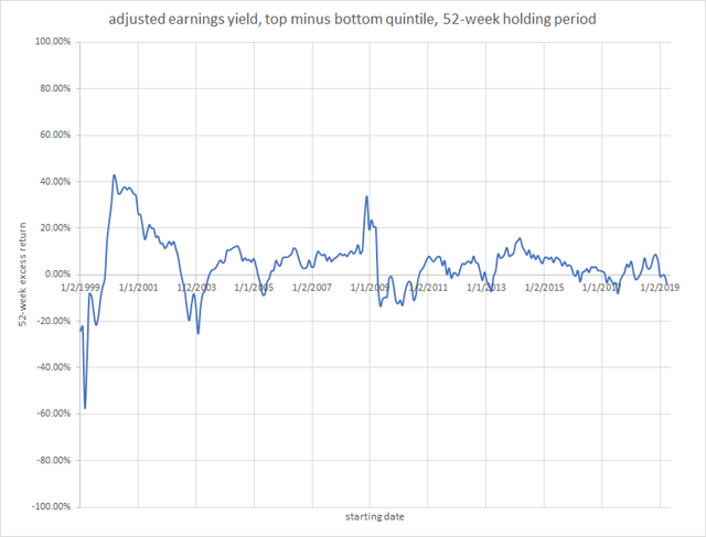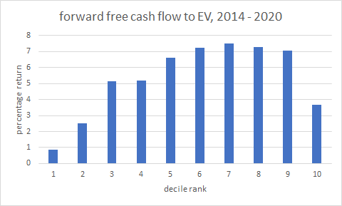 So I’m now going to show you some charts based on three other measures of value. All of these are structured as “yield” ratios—i.e. the price is in the denominator rather than the numerator, so we’re looking at highest quintile minus lowest. This difference can be purely cosmetic—all of the above quintile charts would have looked exactly the same if I’d used, say, EBITDA/EV rather than EV/EBITDA and excluded companies with negative EBITDAs from the top and bottom quintiles, and all of the decile charts would be mirror images of the ones above. But when you use yield-based formulas you don’t exclude companies with negative earnings or free cash flow. Instead they go in the bottom quantile(s) and companies with strong earnings, free cash flow, and so on are in the top.