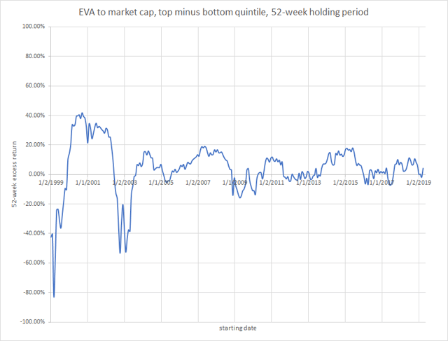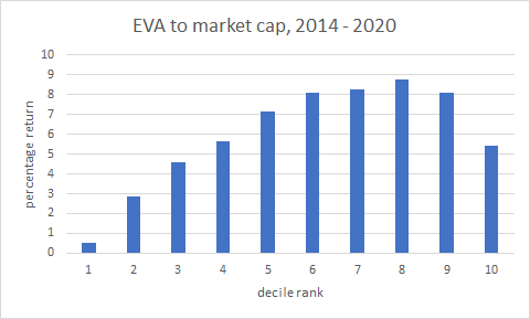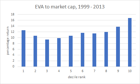EVA stands for economic value added, a measure Joel Stern came up with in the 1960s. Essentially it’s the net operating profit after taxes minus the product of the weighted average cost of capital and the economic assets employed. I divide that by the company’s market cap.