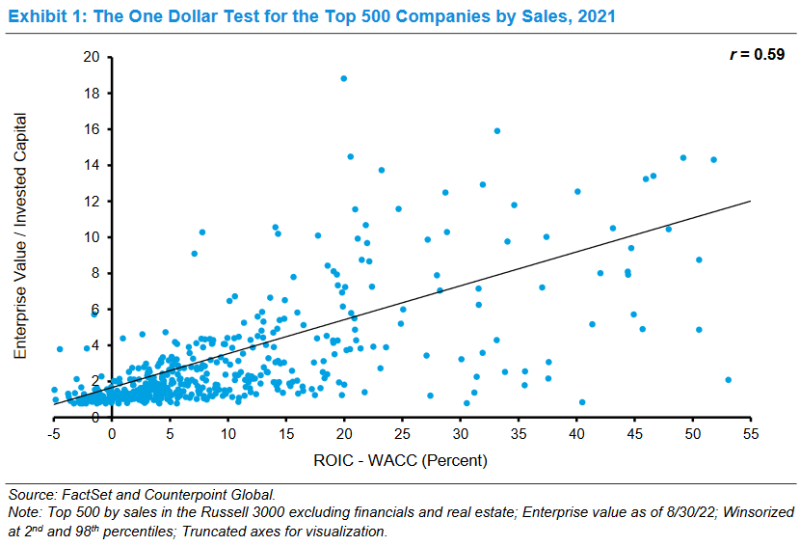 Near the beginning of the paper, Mauboussin and Callahan point out that there’s a very strong correlation between a) the difference between return on invested capital (ROIC) and the weighted average cost of capital (WACC) and b) enterprise value (EV) divided by invested capital (IC). See Exhibit 1, the chart on page 2 of the paper, which I take the liberty of reproducing below.