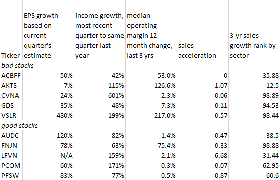 In the first column is each stock’s estimated EPS growth, which I calculate by taking the current quarter’s estimated EPS, subtracting the reported EPS for the same quarter last year, and dividing by the absolute value of the latter. There’s a pretty big divide between the good stocks and the bad stocks here, with the exceptions of GDS, which is showing healthy growth, and LFVN, for which no EPS estimate is available. In the second column is actual income growth, which I calculate by taking the most recent quarter’s net income, subtracting that of the same quarter last year, and dividing by the absolute value of the latter (I adjust the income figures by subtracting a fraction of the “special items” reported). Once again, you can see a major difference between the bad stocks and the good ones. In the third column is a figure representing change in operating margin. This is the median difference between each of the last twelve quarters and the same quarter the previous year. The best option would be a number in the range of 0% to 3%. As you can see, ACBFF, AKTS, VSLR, and FNJN give me alarmingly high and low numbers here. In three of these companies, income growth is outpacing sales growth to an alarming degree, and in the case of AKTS, income is falling far faster than sales. In the fourth column is sales acceleration. This is a rather complicated factor. You first measure the sales growth by comparing this quarter to the same quarter last year. Then you measure it by comparing the last twelve months to the twelve months before that. Lastly, you take the difference between those two numbers and divide it by the second. All the good stocks have accelerating sales, while three of the bad stocks have decelerating sales. In the last column is the rank, by sector, from 0 to 100, of the sales growth over the last three years. What I’m looking for here is a number close to 70. Sales growth that is extremely high—like that of CVNA, GDS, VSLR, and FNJN—is likely going to result in some disappointment down the line, and poor sales growth like that of ACBFF, AKTS, AUDC, and LFVN is not very promising. The best stocks in this column are PFSW and PCOM.