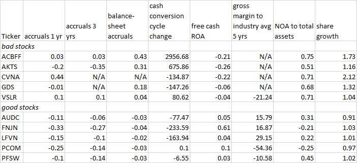 In the first three columns are various accrual measures. I want these to be negative, with the lower the better, and indeed all the good stocks have negative accruals across the board. The first two columns measure the difference between operating cash flow and net income, divided by total assets; the third measures the difference between the last twelve months’ net operating assets and that of the previous twelve months, divided by average total assets. CVNA is too young a company for me to have much data, but its one-year accruals are terrible. The difference between the balance-sheet accruals for the bad and good stocks is particularly notable. Ideally, the change in the cash conversion cycle between one year and another shouldn’t be more than three months, and you can see that VSLR, AUDC, PCOM, and PFSW are within that range. The rest of the stocks are presenting somewhat worrisome numbers here. Free cash ROA is the most recent quarter’s free cash flow (net cash flow from operations plus net cash flow from investments) divided by total assets. The bad stocks all have negative numbers, the good stocks all positive. The reason for all the N/As in the gross margin column is that all these bad stocks are less than five years old. The number here is the company’s gross margin minus the industry average—a great measure of a company’s “moat.” I’m looking for positive numbers here, so the figures for PCOM and PFSW are less than ideal. Net operating assets to total assets is my number-one quality ratio (I’ve written about it here). I want the number here to be low—definitely under 0.5. Indeed it is for all the good stocks, and it’s too high for all the bad ones. Lastly, I’d rather invest in a company that’s reducing its share count after splits than one that’s increasing it. This measure is the current share count divided by the share count a year ago, adjusted for splits. The amount by which ACBFF, CVNA, and GDS have increased their share count is troubling.