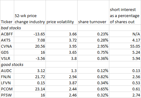 I would rather invest in a stock in an industry with some momentum, so the numbers in the first column for CVNA, GDS, FNJN, PCOM, and PFSW are encouraging, while those for ACBFF and VSLR are dismal. Because most of these are small and microcap stocks, price volatility, as measured by the standard deviation of the daily returns over the last three months, is pretty high. AUDC, though, is a nice exception. I wrote about share turnover here, and once again AUDC is posting some nice low numbers, while CVNA is damn scary. And the short interest in all of the bad stocks is way too high for my liking—though CVNA, with short interest at 55% of its shares outstanding, could be ripe for a short squeeze were its other numbers not so dismal.