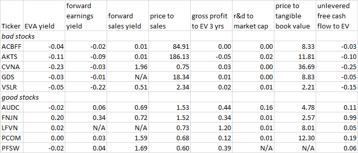 EVA is economic value added, a measure devised by Joel Stern in 1983 for maximizing value at firms for which he consulted. Basically, EVA is the company’s net operating profit after taxes minus the product of the weighted average cost of capital and the economic capital employed. I like to measure the EVA of companies I invest in and divide that by their market cap. Most of these companies have negative EVAs, but FNJN’s EVA is outstanding compared to the company’s price. Forward earnings yield and forward sales yield are basically the current year’s earnings and sales estimates divided by the market cap. You can see the numbers are far better for the good stocks than the bad stocks on the whole, with the exception of CVNA’s forward sales yield. The price to sales ratio (trailing twelve months) for the bad stocks is astonishingly high, with the exception of CVNA, while for the good stocks it’s less than 2. Gross profit to enterprise value is one of my mainstays, and you can see it’s far better for the good stocks than the bad. AUDC’s ratio of R&D to market cap is quite strong, while that of all the “bad stocks” except AKTS is pretty terrible. Price to tangible book value is a somewhat problematic ratio, but in the extremes it’s a good measure of overpriced and underpriced companies. It’s essential to measure this against other companies in the industry, and by this measure FNJN is particularly strong and AKTS and CVNA particularly weak. Unlevered free cash flow to enterprise value is the foundation of discounted cash flow analysis, and you can see quickly that all the bad firms fall down on this measure, while AUDC, FNJN, and PCOM are posting some very healthy ratios. I also look at dividend yield and payout ratios, but none of these ten stocks pays dividends (though AUDC announced one after this article was mostly written).