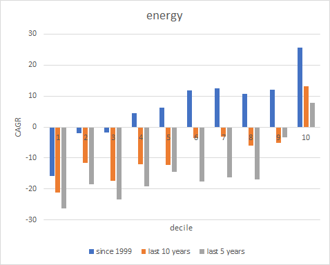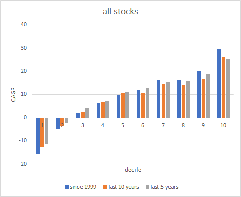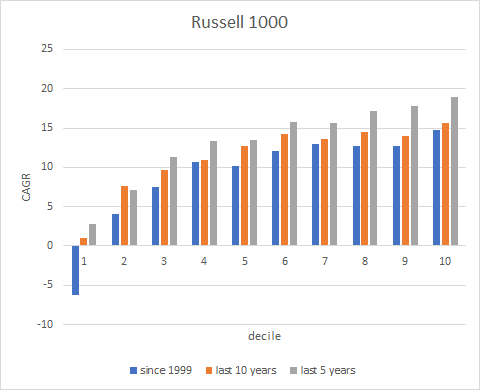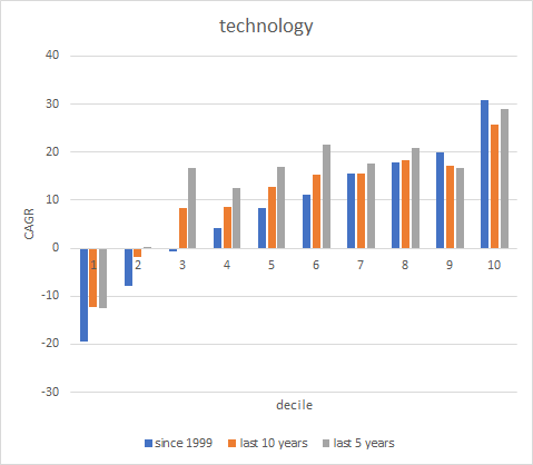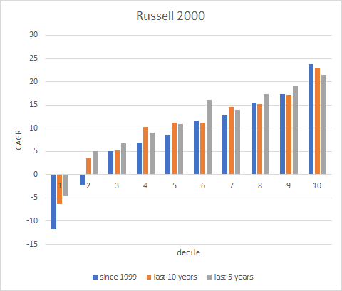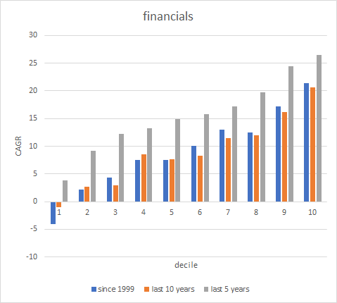 To conclude, below are a few decile backtests I’ve done on my ranking system using Portfolio123. These show the annualized returns of ten equal portfolios based on stock ranks, with a quarterly rebalance and no slippage, for six different groups of stocks. I have not optimized my system for these groups—in fact, I use exactly the same rules to rank a microcap as a large cap, and only a few of my rules are particular to sectors. (Please note: I did not include REITs in these backtests because I will be offering a different ranking system for those.)
