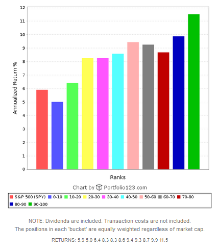 The ratio has produced similar results for the last twenty years too. I divided companies in the Russell 1000 into deciles depending on the ratio of NOA to total assets, with a monthly rebalance since January 1999, and looked at their price performance, using data available from Portfolio123. Here are the results, with the right-most decile having the lowest ratio. (The left-most bar is the return of the S&P 500 without dividends; the other bars include dividends.)
