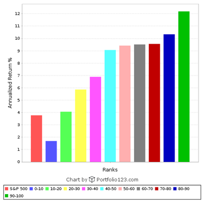 If you were to buy the stocks in each decile of the S&P 500 according to sustainable yield and rebalance monthly since 1999, here’s what you’d get: