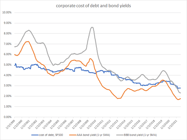 As you can see, the cost of debt for managers has remained pretty steady over the last twenty years, declining gradually from 5% to 3%. Bond yields, however, have varied a huge amount. Their general direction is the same, but the actual percentages are quite different. (To measure the cost of debt I took all S&P 500 stocks with interest expense and debt on their books and averaged their one-year cost—their after-tax interest expense divided by their debt. For the bond yields I used the one-year simple moving average of the daily yields for both AAA and BBB bonds.)