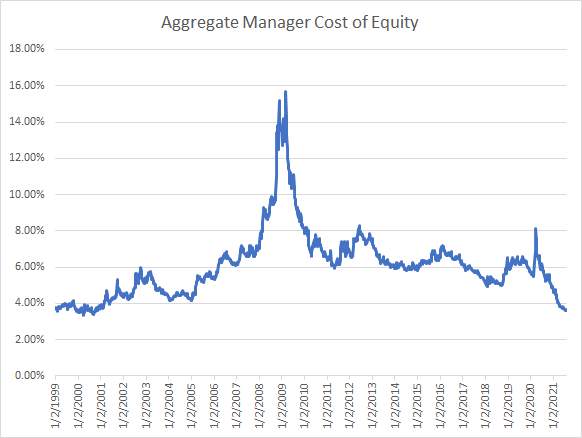 (This is the aggregate annual manager cost of equity for the S&P 1500, using Compustat data via Portfolio123.) We can see that the aggregate manager cost of equity varies from about 4% to 14%, and averages 6.08%.
