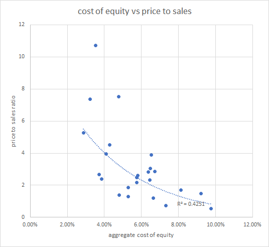 In fact, the cost of equity, when measured in this way, has a very strong negative correlation with price to sales. That’s not a coincidence: the denominator of the cost of equity is the same as the numerator of the price-to-sales ratio. The following chart shows the accounting cost of equity and the price to sales of each GICS industry group (using cap-weighted five-year averages).