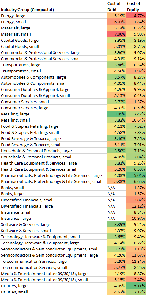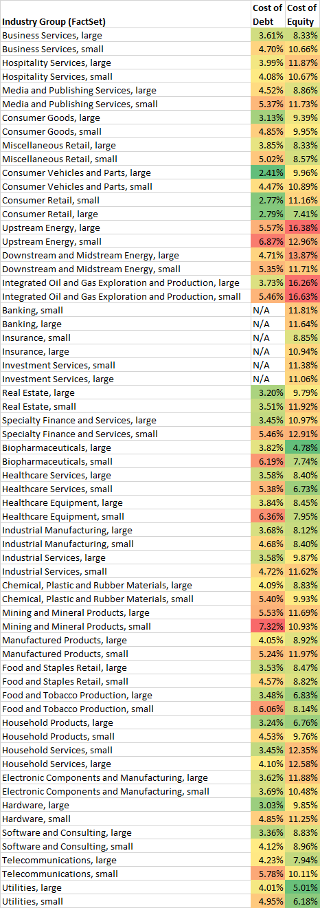 Here are the current costs of debt and equity by industry group, using both Compustat and FactSet classifications. (The cost of capital will depend on the ratio of debt to equity.)