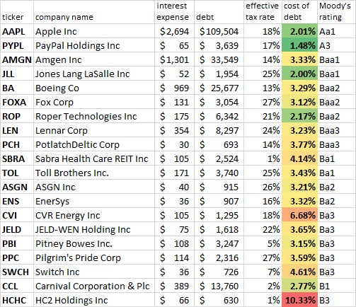 We assume that the cost of debt is the same for investors and for the company’s own managers. So I chose twenty US companies with bond ratings at random and calculated their cost of debt. (I used five-year averages for the interest expense and debt and a five-year median for the effective tax rate, and relied on Portfolio123 for screening the stocks, using Compustat data.) I then looked up their bond rating from Moody’s. The results are as follows, sorted by bond rating from best to worst:
