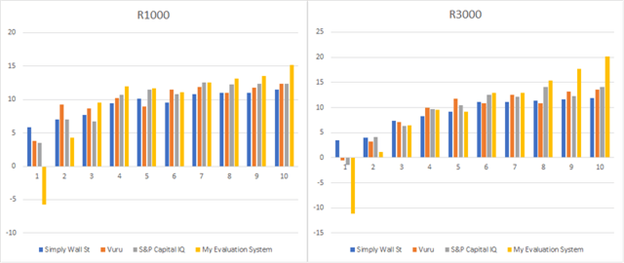 Using Portfolio123 I’ve re-created approximations of the ranking systems of Simply Wall Street, Vuru, and S&P Capital IQ, whose systems are the most transparent, so that I could see how well their criteria backtest. In the charts below, I look at the decile performance based on quarterly portfolio rebalancing since January 1999 of their ranking systems using two different universes, the Russell 1000 and the Russell 3000, removing financials, utilities, REITs, MLPs, and royalty trusts. (Simply Wall Street and S&P Capital IQ use alternative measures for financials and REITs, but Vuru doesn’t appear to do so.) I also offer, for comparison, my own evaluation system (which does cover financials but not REITs or utilities, and which you can read about more below if you’re interested). See the two charts below.