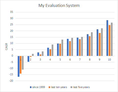 Below is my ranking system’s performance by decile, rebalancing quarterly since 1/1/1999, for the last ten years, and for the last five years, for a universe encompassing all stocks available for purchase in the US with a price greater than $0.25 and a minimum median daily dollar volume of $2,000, with the exception of REITs, utilities, MLPs, and royalty trusts. This chart will definitely improve before I start offering the service.