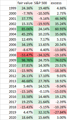 My test is to check every week among all stocks listed on US exchanges and to buy them if a) their market cap is $30 million or more; b) their price is $1.00 or more; and c) their fair value is three times their market cap or more. I will then hold them through thick and thin until their market cap becomes greater than their fair value—or until they’re delisted or are bought by another company.