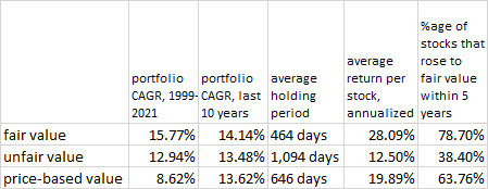 On every measure—CAGR, average holding period, return per stock, and percentage of stocks that rise to fair value—the original “fair value” method works far better than the “unfair value” or the “price-based value” method.